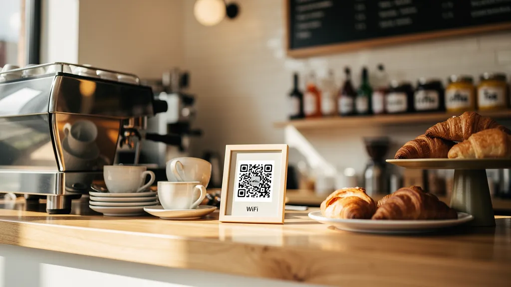 A WiFi QR code lets customers connect to your network instantly by scanning—no typing passwords required. To create one: enter your network name (SSID), password, and security type (usually WPA2) into a WiFi QR generator, test the code, then display it prominently at reception desks, table tents, or wall signs.